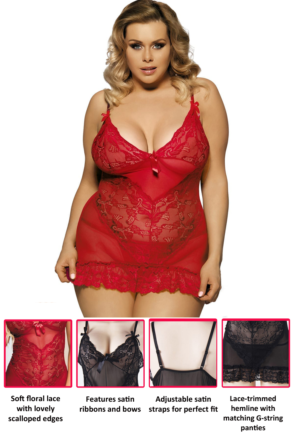 The combination of sheer mesh and sweet-looking flower lace makes this camisole babydoll sexy and elegant.