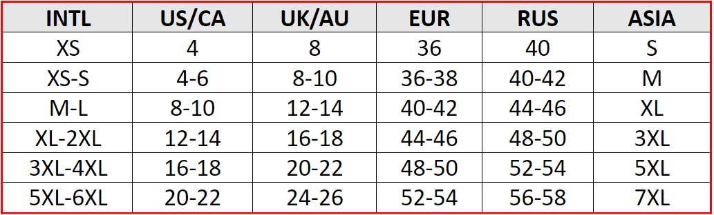 XS-S, M-L, XL-2XL, 3XL-4XL, 5xl-6xl