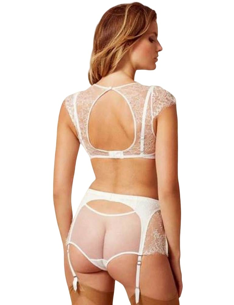 • The set comes with a bra, panty, integrated garter belt and matching stockings